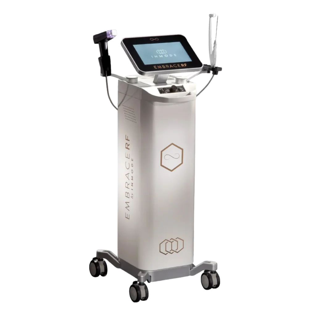 フェイスタイトは、イスラエルのインモード社が開発した「エンブレイスRF」というプラットフォームに含まれる、高周波を用いた最新のタイトニング治療機器です。極細のカニューレを使用して皮下組織に直接アプローチを行うため、皮膚表面からの照射治療に比べて飛躍的に高い引き締め効果が期待できます。